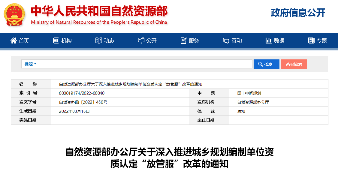 2022年03月16日,自然资源部办公厅发布《关于深入推进城乡规划编制单位资质认定“放管服”改革的通知》。