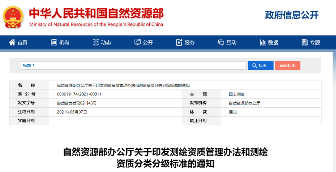 2021年6月7日,自然资源部办公厅印发《测绘资质管理办法》和《测绘资质分类分级标准》。
