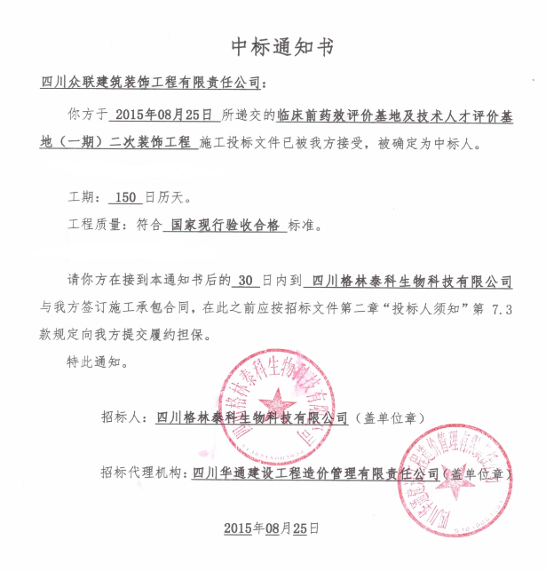 经过近两周的精心准备和努力工作,我司终在2015年8月25日四川格林泰科生物科技有限公司的临床前药效评价基地及技术人才评价基地(一期)二次装饰工程上,拿下一标。在8月的尾声给大家带来欣喜。 随后我司将安排优秀的工程施工队伍,以优质的施工技艺和优良的项目管理,展示我们的实力。 上一篇上一篇佳节将近喜中一标 下一篇下一篇东府幼儿园项目顺利竣工