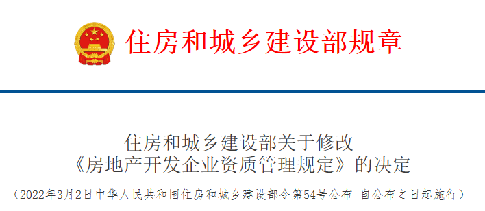 2022年3月16日,住建部发布《住房和城乡建设部关于修改<房地产开发企业资质管理规定>的决定》,自公布之日起施行。