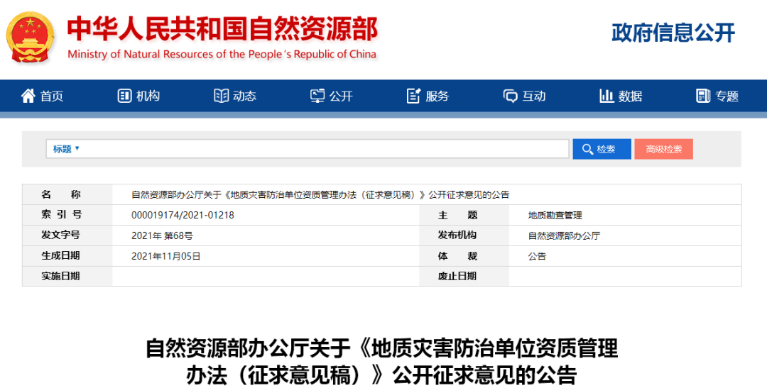 2021年11月5日,自然资源部发布关于《地质灾害防治单位资质管理办法(征求意见稿)》公开征求意见。
