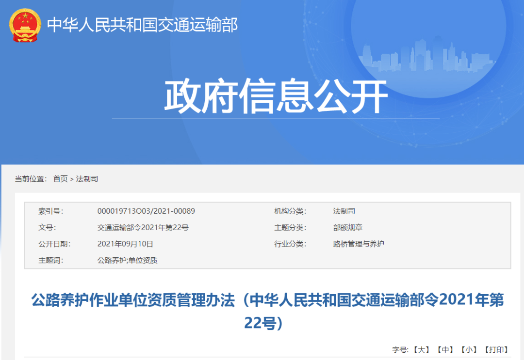 2021年8月25日,《公路养护作业单位资质管理办法》经交通运输部第22次部务会议通过。