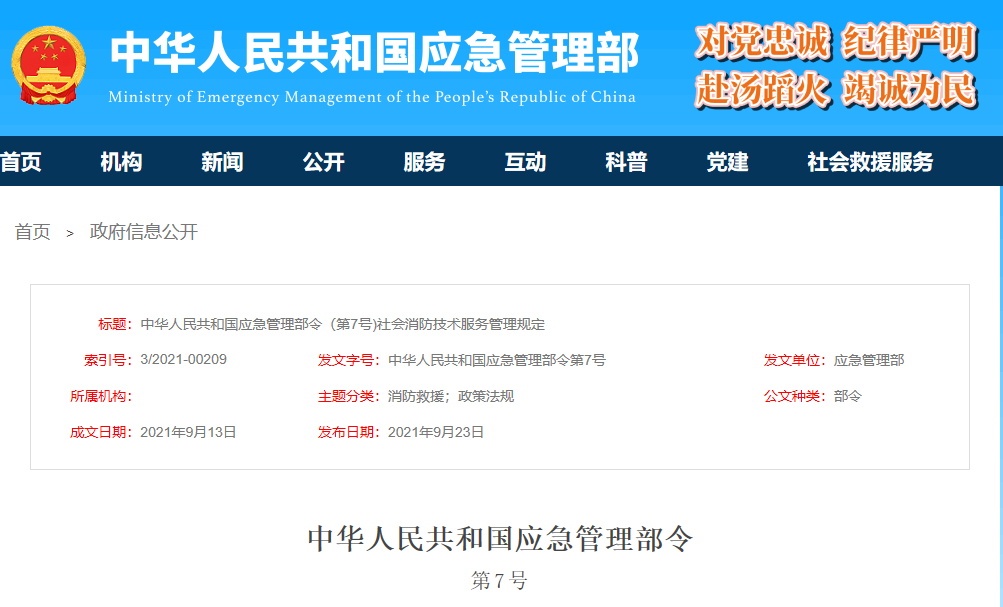 2021年8月17日,《社会消防技术服务管理规定》经应急管理部第27次部务会议审议通过,现予公布。